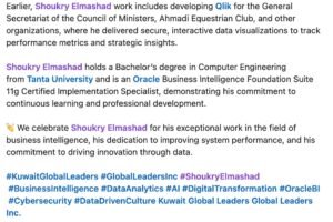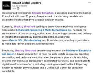 أعلنت منصة Kuwait Global Leaders ، المنصة الرائدة في تسليط الضوء على الكفاءات القيادية والمؤثرة في سوق العمل، عن اختيار المهندس شكري المشد كأحد القادة المتميزين في مجال ذكاء الأعمال (Business Intelligence) ويأتي هذا الاختيار تقديراً لمسيرته المهنية الحافلة التي تمتد لأكثر من 20 عاماً، نجح خلالها في تحويل “البيانات الصماء” إلى رؤى استراتيجية تدعم اتخاذ القرار وتحدث فارقاً ملموساً في المؤسسات التي عمل بها.