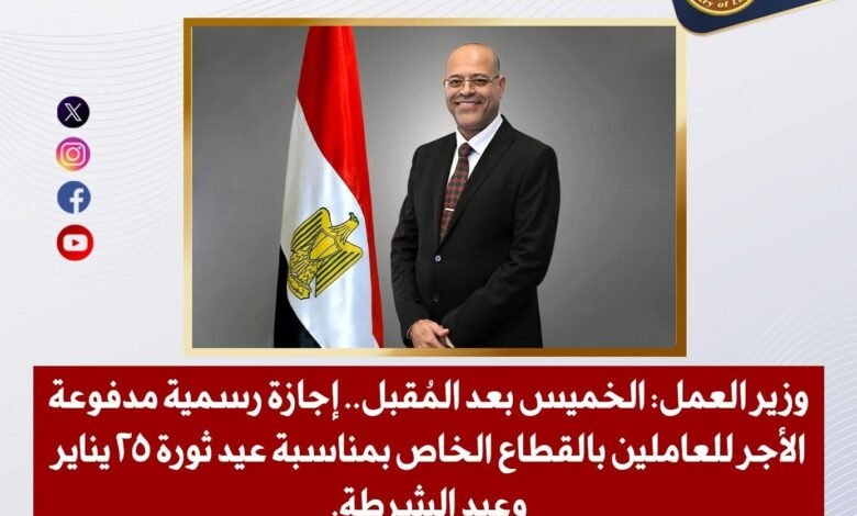 وزير العمل: الخميس بعد المُقبل.. إجازة رسمية مدفوعة الأجر للعاملين بالقطاع الخاص بمناسبة عيد ثورة 25 يناير وعيد الشرطة
